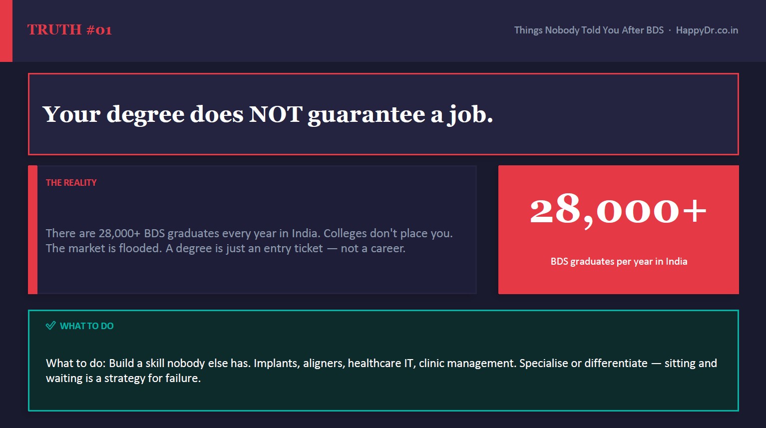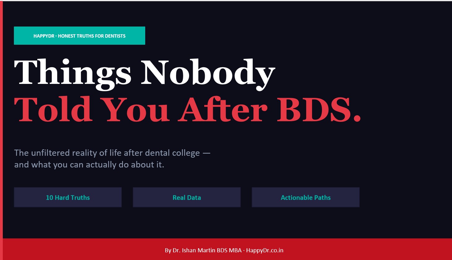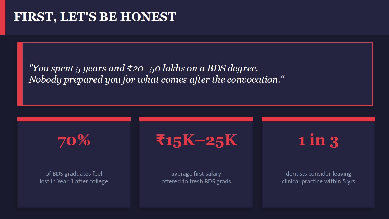 I created HappyDr because I saw a clear gap in the dental journey. Dentists spend years mastering clinical skills, yet many feel lost when it comes to career direction, clinic setup, business decisions, and finding genuine mentorship. After dental college, most of us are left to figure things out on our own, often relying on scattered advice, WhatsApp forwards, or trial and error.